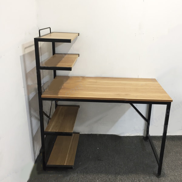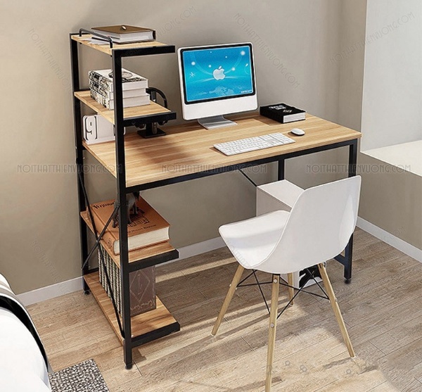 Bàn làm việc có kệ trang trí được làm bằng chất liệu gỗ công nghiệp phủ melamine, mặt bàn có độ dày 18 mm. Bàn có thiết kế dạng phẳng với mặt bàn nhẵn bóng. Đặc biệt bàn còn được tích hợp thêm phần giá sách phía cạnh, tăng không gian để đồ cho bạn. Khung bàn được làm từ khung sắt hộp 25×25 phun sơn tĩnh điện và phủ bóng đảm bảo độ bền và thẩm mỹ.