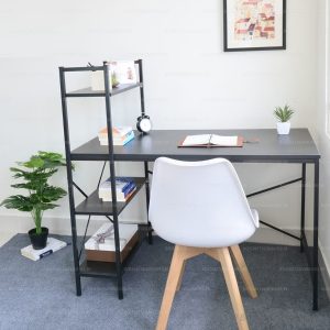 Bàn làm việc có kệ trang trí được làm bằng chất liệu gỗ công nghiệp phủ melamine, mặt bàn có độ dày 18 mm. Bàn có thiết kế dạng phẳng với mặt bàn nhẵn bóng. Đặc biệt bàn còn được tích hợp thêm phần giá sách phía cạnh, tăng không gian để đồ cho bạn. Khung bàn được làm từ khung sắt hộp 25×25 phun sơn tĩnh điện và phủ bóng đảm bảo độ bền và thẩm mỹ.